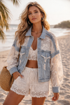 Blending classic cool with bohemian elegance, this piece features intricate floral lace panels on the shoulders and sleeves, beautifully adorned with subtle sequin details for a touch of sparkle.