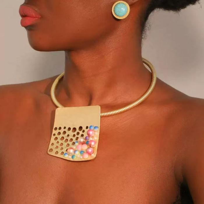 Designed for women who love artful jewelry, this statement collar features a sleek gold band and a sculpted pendant dotted with vibrant pearls. The playful mix of colors and clean geometric lines creates a striking, contemporary look that elevates any outfit.