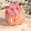 The centerpiece is a voluminous, soft pink tulle/fabric flower accented with cascading beaded tendrils in yellow and pink for a whimsical, dewdropped effect